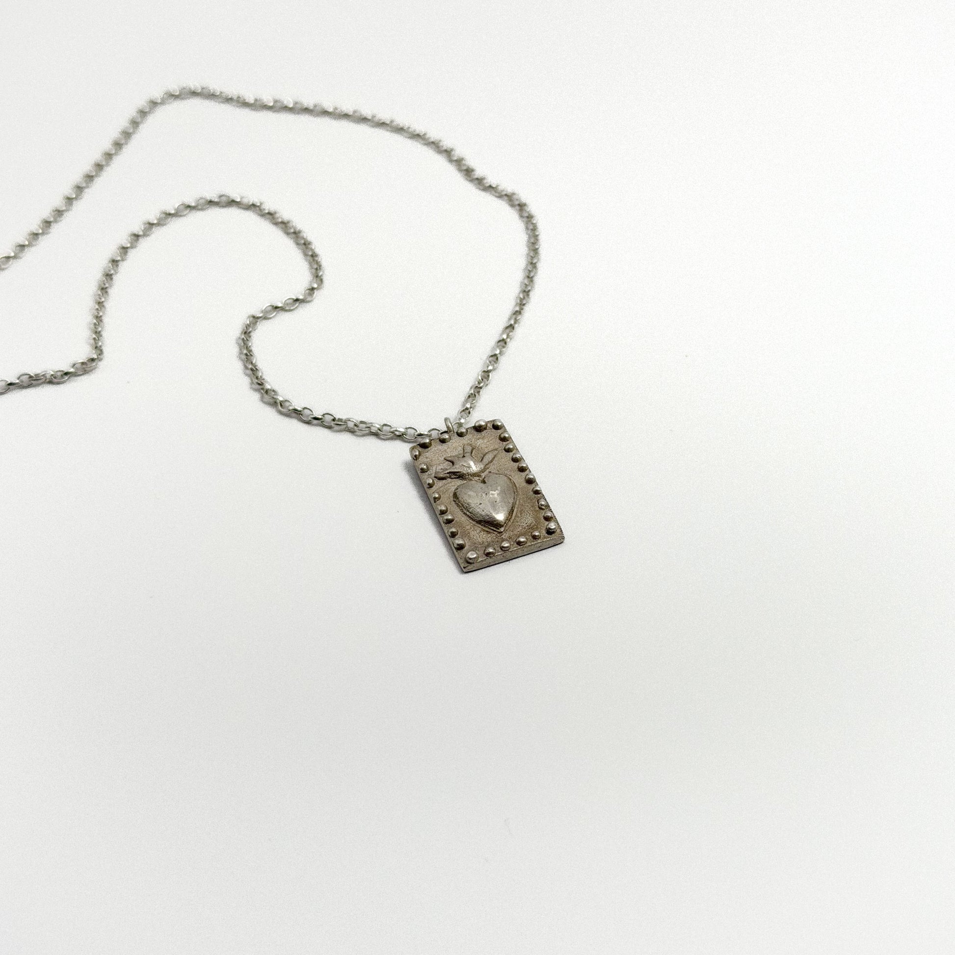 En argent 925, son pendentif rectangulaire orné d’un cœur sculpté mêle douceur et structure.
